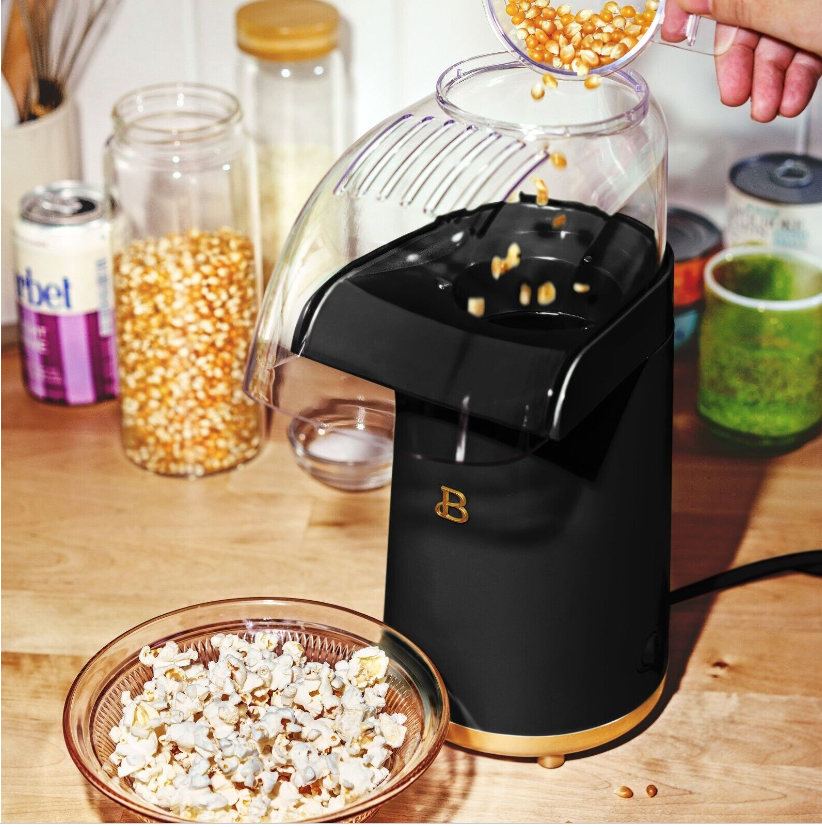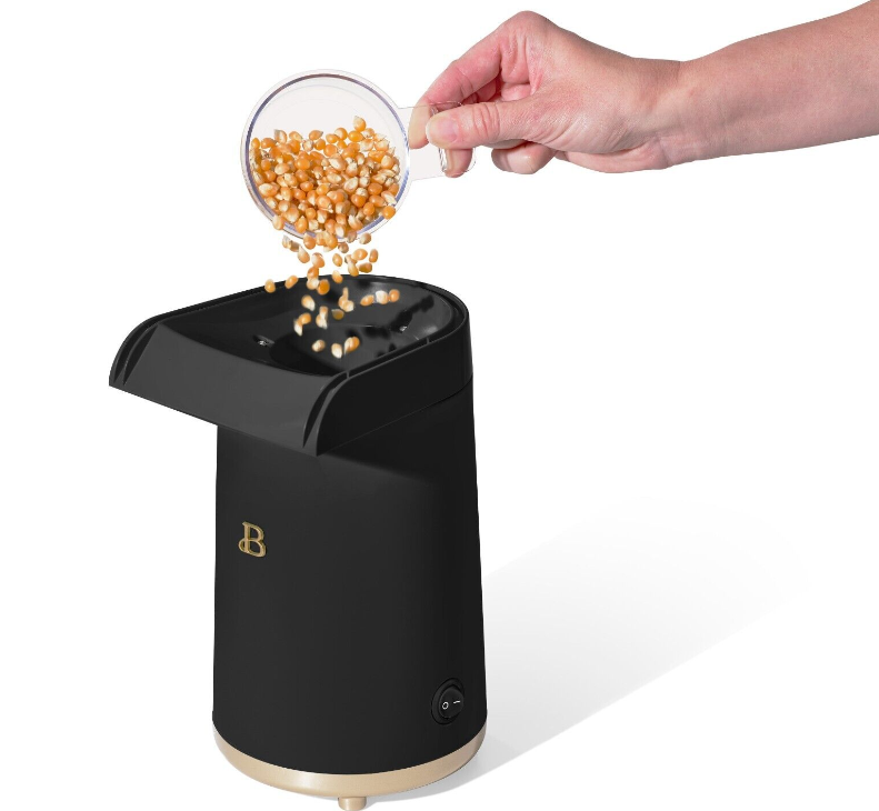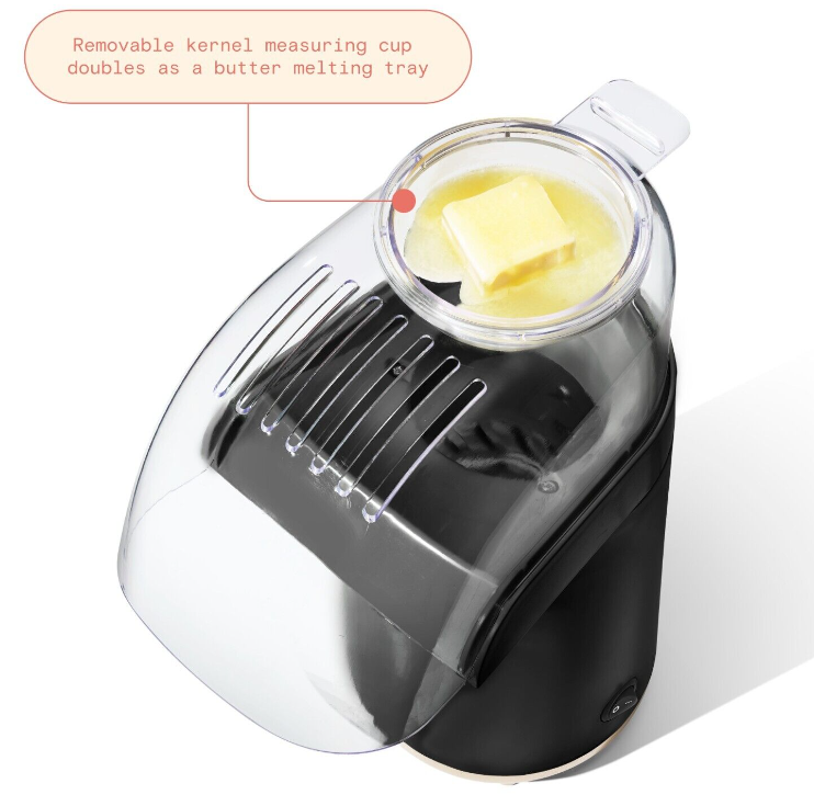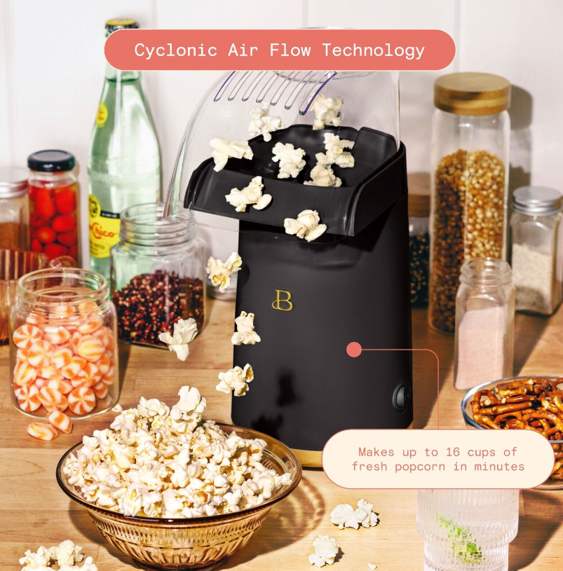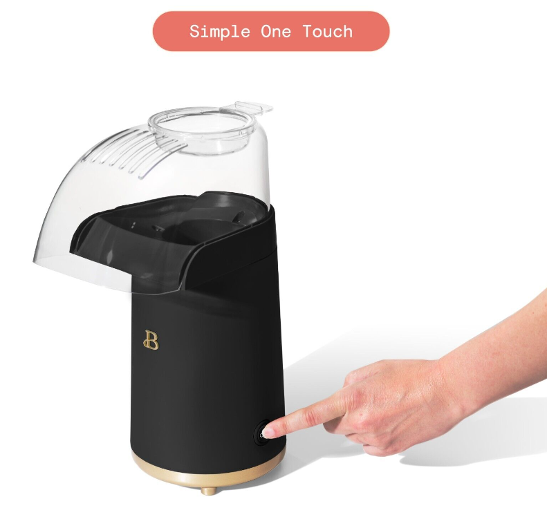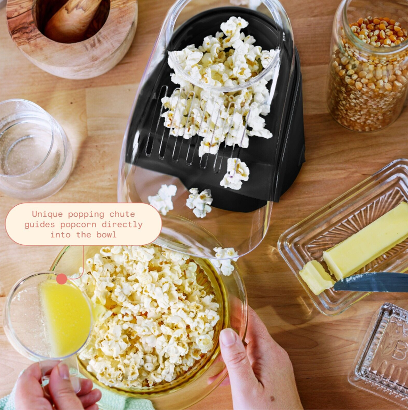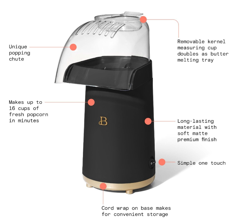 | Superior cyclonic air flow technology for faster popping Makes up to 16 cups of fresh popcorn in minutes 1200watt heating system for quick popping No oil needed – pops with hot air for healthier popcorn Removable kernel measuring cup doubles as a butter melting tray Unique popping chute guides popcorn directly into the bowl Simple one touch: add kernels and start popping Long lasting material with soft matte premium finish Cord wrap on base makes for convenient storage Dishwasher safe parts for easy cleaning |