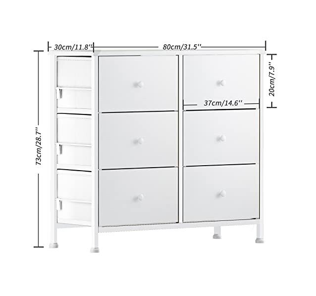 [White Dressers & Chests of Drawers]: Features 6 removable storage drawers made of high-quality non-woven fabrics, wooden front , Wooden handle is not only convenient but also beautiful,no matter kids or adult. Overall dimension: 31.5''*11.8''*28.7''.Drawer dimension: 14.6’’*11.8’’*7.9’’. [Wooden Top and Front ]: This white cloest dresser drawer organizers has water-resistant wood top and particleboard drawer front,offer stable support and ensure years of use,convenient to clean. [Strong and Sturdy System] : High quality steel frame,each drawer has a special Velcro strips to keep the drawers always at their slots,super easy to slide in and out but will not bend or fall down. anti-tipping straps ensure the safety of your energetic kids. [Easy Assembly and Move]: Easy to assemble with hardware included in half an hour,4 adjustable feet protect your floor from scratches. It's lightweight so you could move to any room you want to be tidier easily. [Mutifuction Fabric Dresser]: Smaller dimension with larger capacity fits everywhere in your house for closets, bedrooms, nurseries, playrooms, entrance passages,office, nightstand etc. 100% Satisfaction customer service before and after purchase. |