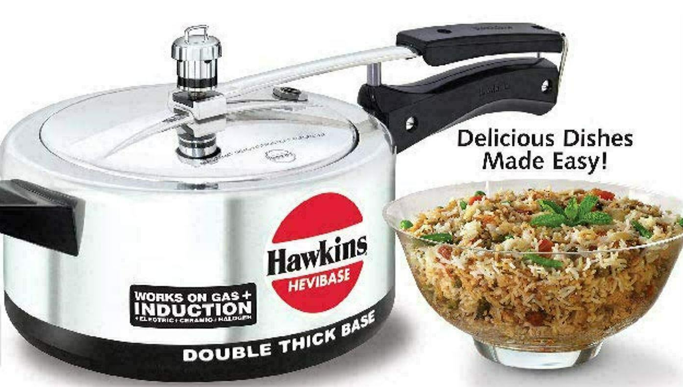 The Hawkins Hevibase pressure cooker made of commercially available pure aluminum is induction compatible with an external base plate made of Aisi 430 grade magnetic stainless steel, which is attached to the double-thick base. It can be used safely on all household gas, electric, halogen, ceramic and induction hobs. The double-thick, heavy base is ideal for lightly frying before pressure cooking. The base stays flat, never bulges. Suitable for gas, electric, ceramic and halogen hobs. A version of this model with a fully hard anodized, double-thickness base was available as the Hawkins Ecobase. This was suitable for household gas, electricity, halogen, ceramics, but not induction hobs. This product is no longer available in certain markets.
