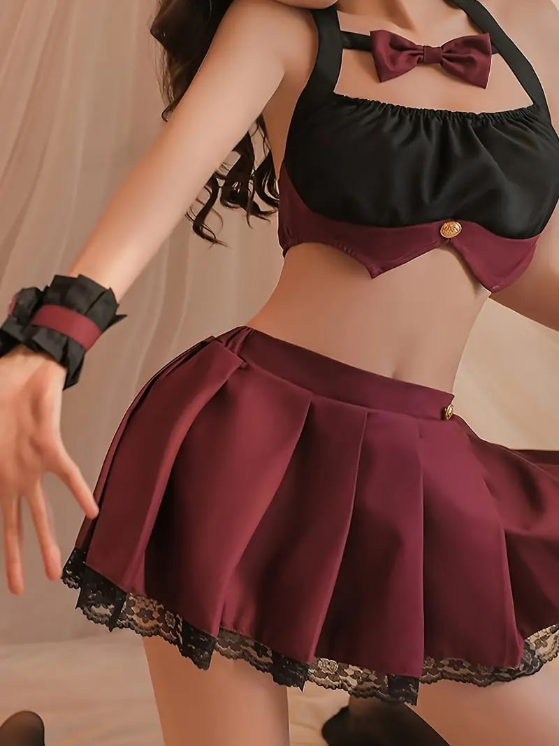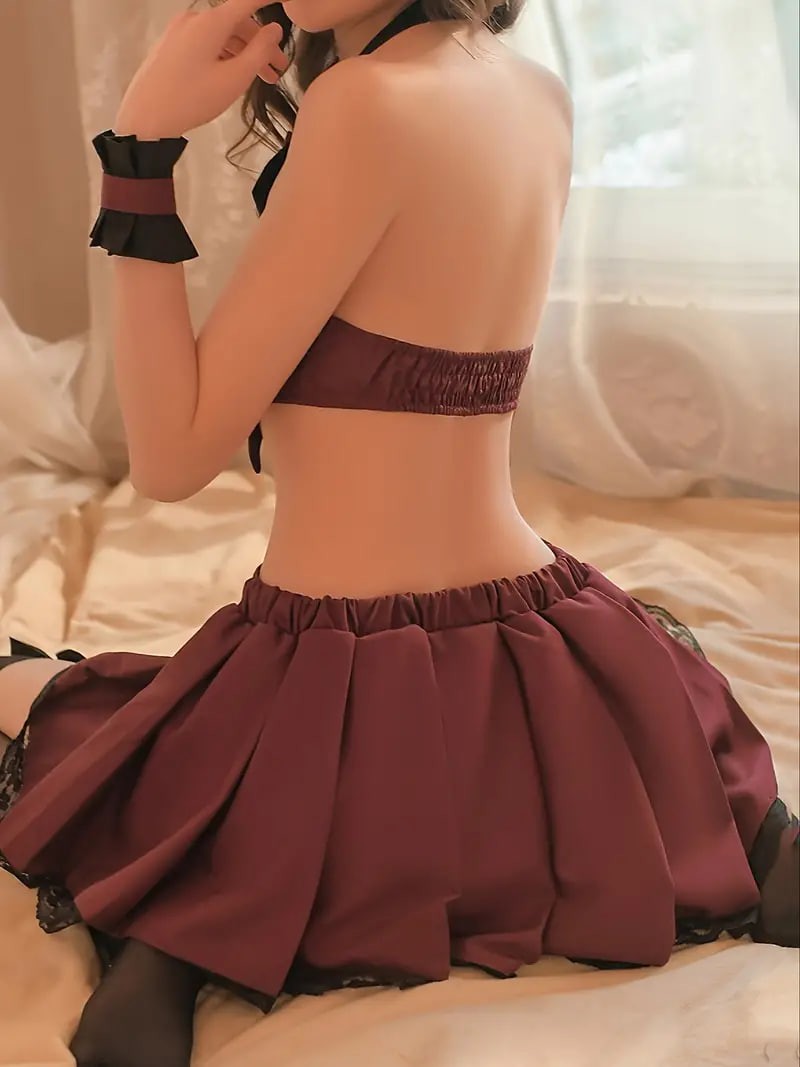 Naughty Preppy Cosplay Costume, Colorblock Bow Knot Cut Out Halter Backless Bra & Lace Trim Elastic Pleated Skirt & Cuffs, Women's Sexy Lingerie & Underwear