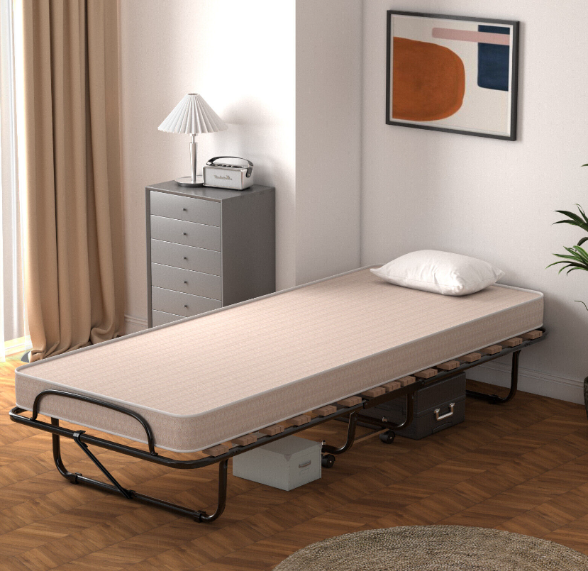 With high soft and high quality foam mattress, this folding bed gives you a cozy and comfortable feeling when you are lying. The study metal construction with dense slatted bar is strong enough to withstand maximum load-bearing capacity of 265 pounds. What's more, this bed is perfect for limited space due to its folding design. And the all-directional wheels allow you to move and store it anywhere. It can be placed in the living room, bedroom, office, study room and more places. Enjoy your leisure time with this upholstered bed!
