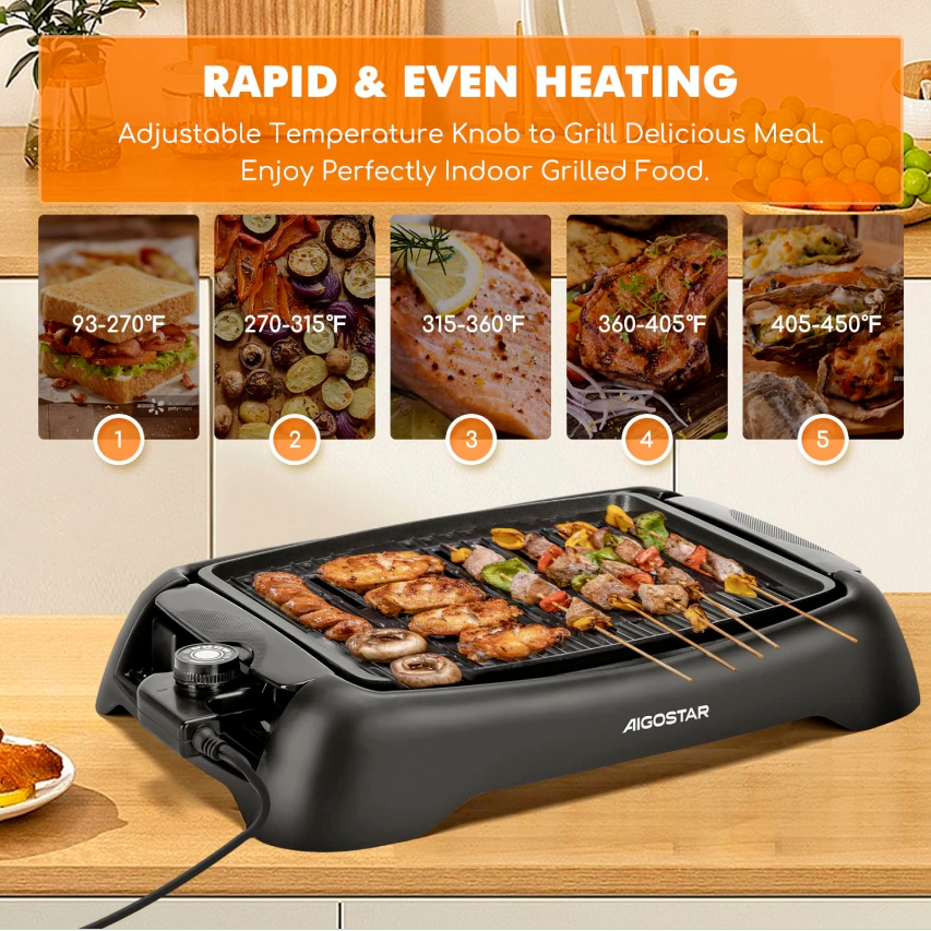 • : 1200W electric grill indoor smokeless with adjustable 5-temp (240℉-455°F) settings that can heat up fast without a long wait before a banquet. The heating element is spread across the surface to ensure that every area of the grill indoor is heated evenly from edge to edge. Preheat the grill at max temperature before cooking and then select your desired/proper temperature to meet the needs of different food, keep foods tender without overcooking.