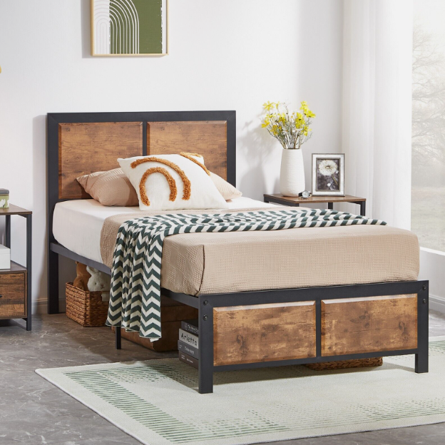 ² Sturdy and Stable】This bed frame is composed of 9 legs and 14 pieces of heavy-duty steel slats, the unique industrial wood grain headboard and footboard add better support to your mattress.